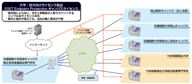 学校法人順正学園は、「学生一人ひとりのもつ能力を最大限に引き出し引き伸ばし、社会に有為な人材を養成する」との建学の理念の下、吉備国際大学と九州保健福祉大学を初めとする5校を運営し、アメリカ、カナダ、イギリス、韓国、中国などの計20カ国61の大学及び、ボストン美術館と教育交流協定を結び、学術交流や外国人留学生の受け入れなど、国際交流を活発に推し進めている。同学園では、2015年にESETEndpoint Protection Advanced(以下、ESETと記載)のキャンパスライセンスを全5校と学園本部に導入。Windows以外のOSを搭載するクライアントマシンにも対応できるようになり、学内ネットワークのセキュリティを更に高めることができたと好評である。キャンパスライセンスの導入により、セキュリティソフトの年間利用料の32パーセント削減を初めとして、サーバー維持費や運用コストも削減できたと報告されている。