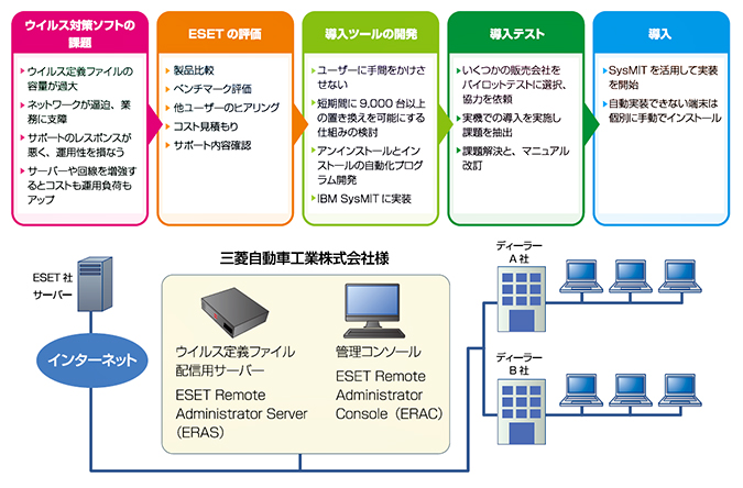 「対象となる販売会社は約100社、対象PCは9,000台以上です。ウイルス対策ソフトの入れ替えと同時に、セキュリティパッチ配布対策も実施する必要があり、いかに短期間に、しかも販売会社の方々に負担をかけずに作業を完了するかという問題がありました。そこで、全PCを統制するツール、IBM SysMITを活用したのです。以前のセキュリティソフトのアンインストールとESETのインストールをプログラム化してこのツールに実装し、各ユーザーは画面表示に従ってボタンを数回押すだけで、ほぼ自動的に旧ソフトの削除とESETのインストールを行える仕組みです。いくつかの販売会社に協力いただいて、パイロット的にこの導入プログラムを試すことで問題点を洗い出し、マニュアルの改訂や、OSごとのパターン作成なども本番前に完了することができました。こうした準備には2カ月程要しました。本格的な導入作業を開始したのは6月の中旬から下旬 にかけてですが、8月の夏季休業前には不在者のPCなどごく一部を除いて、ほとんどのPCで作業が完了しました」