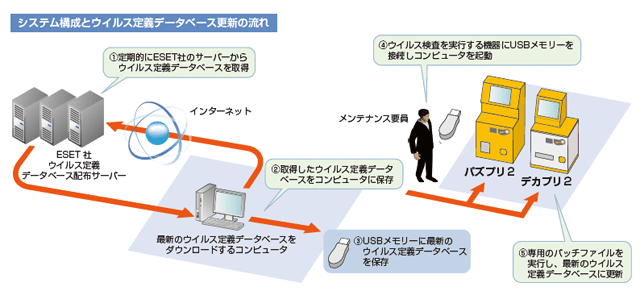 「メンテナンス作業を確実に、効率よく行うための工夫をしています。まず、メンテナンス要員は、全国で数百名いますが、誰でも簡単にできるよう、ウイルス定義データベースの更新作業はできるだけ簡素化したいと考えていました。そこで、メンテナンス時には、USBメモリーにウイルス定義データベース更新のためのバッチファイルを入れ、現地では、それをクリックすれば自動的にアップデートされるようにしました。