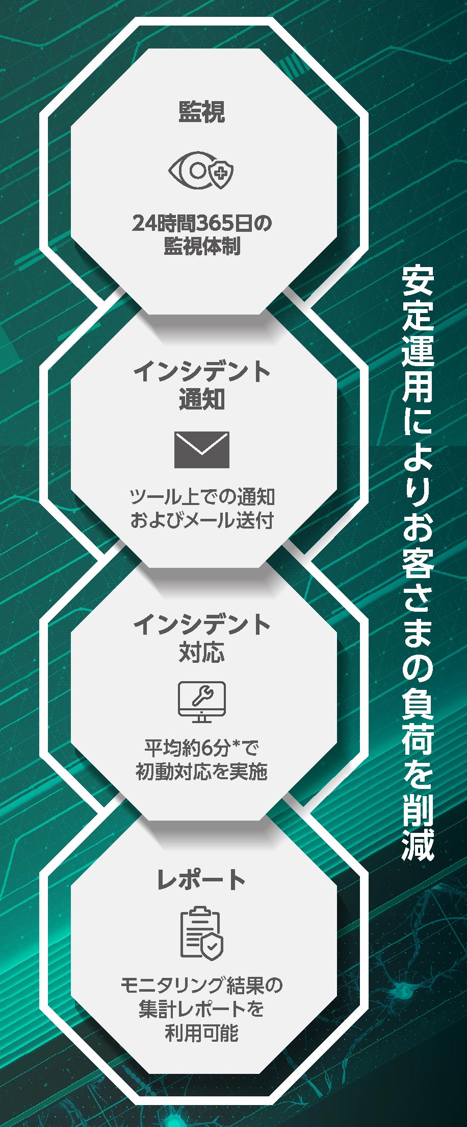 24時間365日体制で脅威を監視し、万一侵入が発生した場合には、AIなどを活用した自動化システムとセキュリティエンジニアによる対応により、脅威の封じ込めなどの初動対応を平均約6分で実施します。