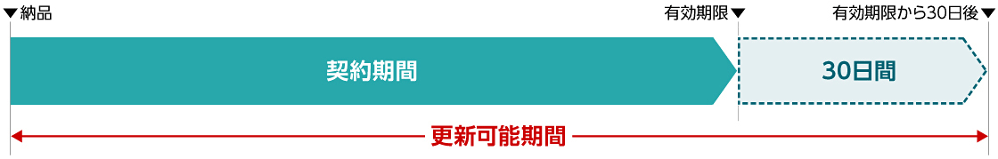 - 契約期間中いつでも(有効期限付近でなくても)、有効期限後30日以内であれば更新が可能です。
