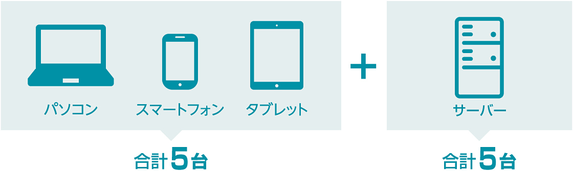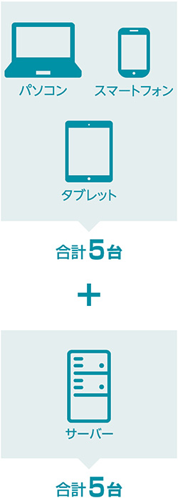 例えば5台版をご利用の場合、パソコン、スマートフォン、タブレットの合計で5台、サーバーで5台利用できます。