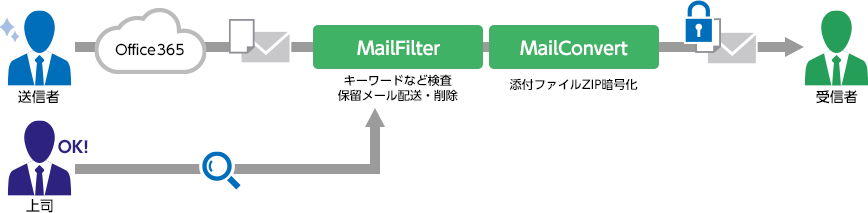 誤送信防止+長期保存による監査対応。送信時のリスクを防ぎつつ、証跡管理でコンプライアンスを強化することを目的とした構築例です。