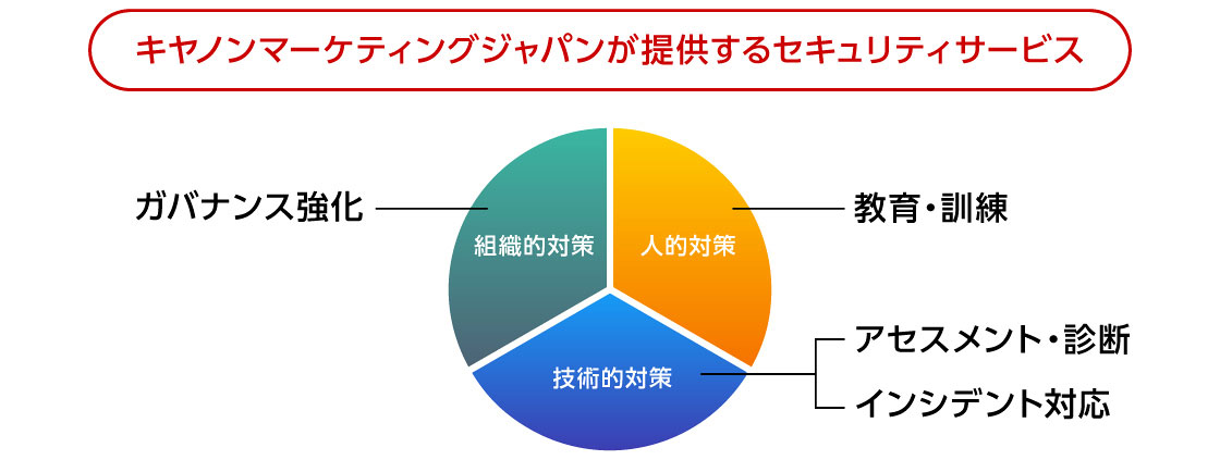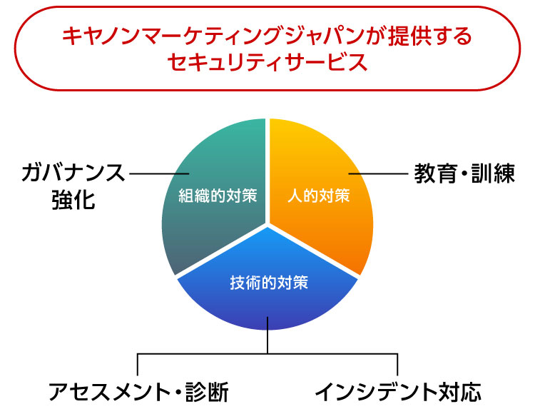 キヤノンマーケティングジャパンではこれまで長きにわたって提供していた技術中心の対策に加え、「組織」・「人」の視点を取り入れた「セキュリティサービス」を数多くご用意しています。