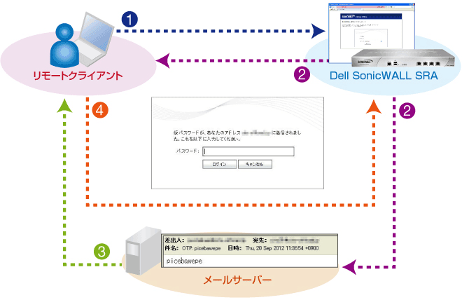 - 指定したメールサーバー側におきまして、他のメールサーバーへのメール転送を制限している場合は、SonicWall SRA/SMAからのOTP発行メールに対して中継を許可する必要があります。