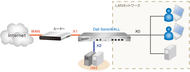 DMZとは、DeMilitarized Zone(非武装地帯、緩衝地帯)の略です。DMZポートはインターネットと内部ネットワークの間に存在します。インターネットに公開する必要のあるサーバーをDMZポートに設置すれば、SonicWallによって外部からのDoS(Denial of Services)攻撃や不正なアクセスから防御することが可能です。また、LANポートと分離することにより、万一公開サーバーが攻撃されても、LANポートへの被害拡大を防ぎます。
