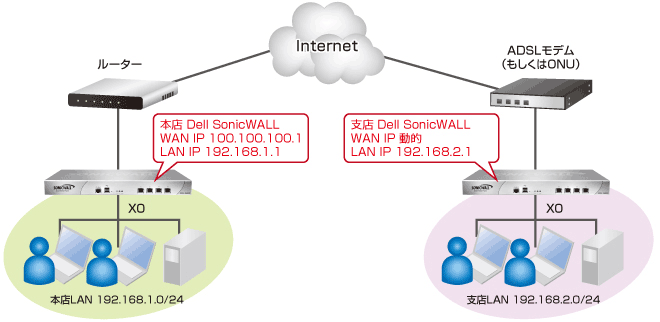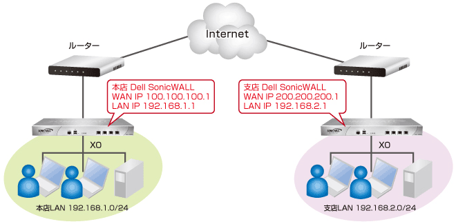 固定のグローバルアドレスを持つSonicWall同士でVPN接続を行う場合の設定例をご案内します。
