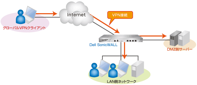 「リモートアクセスVPN」とは、VPNクライアントからSonicWallに対してVPNアクセスを行う構成を指します。