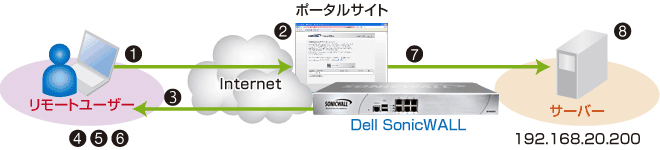 標準的なWebブラウザーよりSonicWallのポータルサイトへアクセスし、以下のSSL-VPN接続が可能。