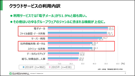 企業におけるクラウドの用途で、51.9%(「情報通信白書平成29年版」より)を占めるのが、メールです。そのほか、ファイル保管やデータ共有、社内情報共有やポータル、スケジュール共有といったグループウェア機能や業務インフラも、クラウドへの移行が進んでいます。