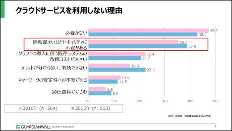 冒頭でも述べたように、企業におけるクラウドサービスの利用が進んでいる一方で、クラウドの利用を躊躇している企業もあります。「情報通信白書平成29年版」によれば、その理由として多くを占めているのが「情報漏えいなどセキュリティに不安がある」という意見です。