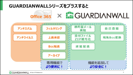 「Office 365」の情報漏えい対策は、「GUARDIANWALLシリーズ」によって補完できます。「GUARDIANWALLシリーズ」なら、標的型メール検知、自己査閲(送信したメールを一定時間保留する機能)、添付ファイルZIP暗号化、宛先BCC変換、遅延配送といった「Office 365」が備えていない情報漏えい対策機能を利用可能です。また、「Office 365」がサポートしているフィルタリング、上長承認、BCC転送、アーカイブといった機能についても、「GUARDIANWALLシリーズ」との組み合わせによって、より便利に利用できるようになります。