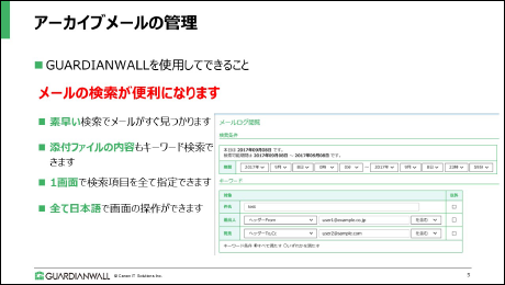 一方、「GUARDIANWALLシリーズ」なら大量のアーカイブメールであっても、横断検索の技術を利用して負荷分散することで、すばやく目的のメールを検索できます。また、添付ファイルの内容のキーワード検索や、1画面での複数の検索条件指定が可能で、すべての操作画面が日本語表記になっているなど、「Office 365」のアーカイブ機能で指摘されている課題が解消されているのも特長です。