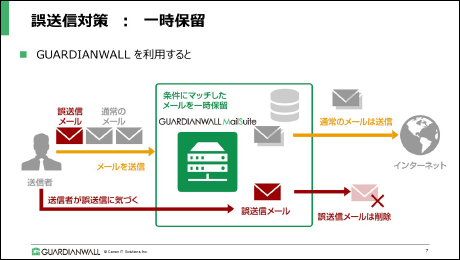 「GUARDIANWALLシリーズ」の「一時保留」機能では、条件に合致したメールの送信をメールサーバー上で一時保留することで、送信者が送信後ただちに誤送信に気づいた場合、送信をキャンセルすることが可能です。保留されたメールは、一定時間が経過すると自動送信される設定のほか、送信者自信によるチェックを徹底させるために、一定時間が経過しても自己査閲しないメールを自動で削除する設定もできます。
