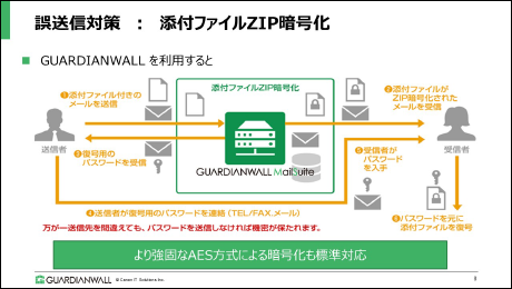 「GUARDIANWALLシリーズ」なら、添付ファイルを自動的にZIP暗号化するだけでなく、暗号化前のファイルに対してキーワード検査が可能になることにより安全性を高められます。さらに、より強力な暗号化方式であるAES方式を用いた暗号化も可能です。