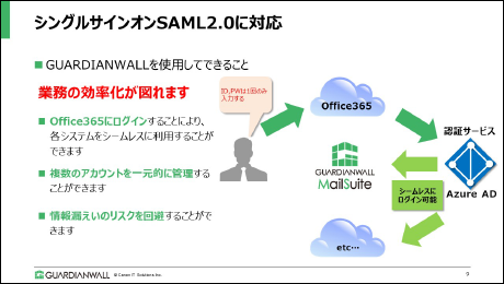複数のクラウドサービスを併用する場合、利用の都度にそれぞれのサービスにログインする必要があったり、複数のログイン情報(ID/パスワード)を管理する必要があったりと、サービスへのログインにおいて何かと不便があります。「GUARDIANWALLシリーズ」は、SAML 2.0準拠のシングルサインオンに対応しているので、「Office 365」にログインすれば、「GUARDIANWALLシリーズ」はもちろん「Microsoft Azure(アジュール)」などシングルサインオンに対応したクラウドサービスをシームレスに利用可能です。シングルサインオンによって、複数のクラウドサービスのアカウント情報を一元管理できるため、複数のログイン情報を管理する手間がなくなるほか、情報漏えいのリスクも抑えられます。
