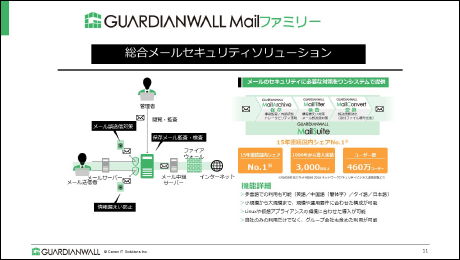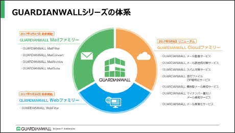 2017年10月現在の製品ラインアップは、「GUARDIANWALL Mailファミリー」「GUARDIANWALL Cloudファミリー」「GUARDIANWALL Webファミリー」の3種です。