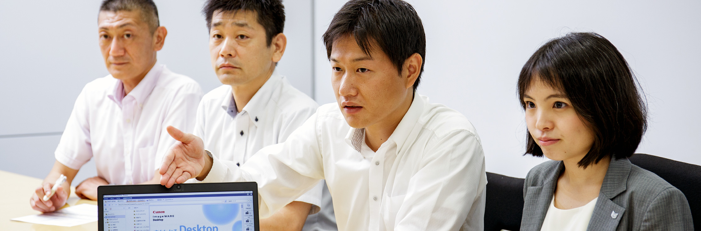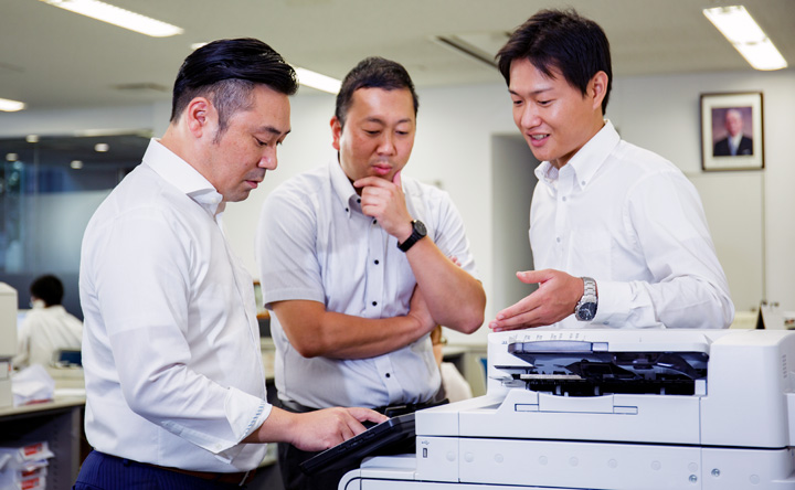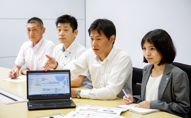 「会社の運営に重要な仕組みを任せるからには、親身に寄り添って手助けしてほしい」。導入に際して落合の会長から言われた言葉を胸に、システムの入れ替え作業では、担当者とともに全国の拠点を回った。各地にあるキヤノンS&Sの拠点と連携し、ときには丸一日かけ、お客さまと一緒になって複合機の設置や使い方の確認を行った。