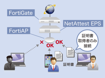 どこでも簡単につながる手軽さはそのままに、電子証明書によるネットワーク認証を実現し、不正な侵入、接続を許さないセキュアな無線LAN環境の構築を支援します。