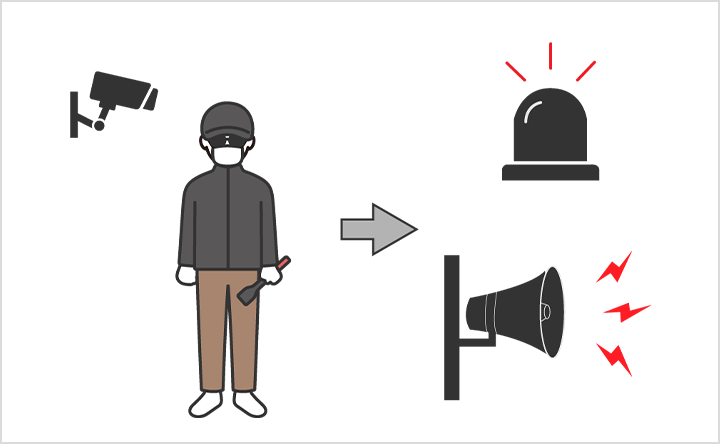 映像と外部機器がシームレスに連携。たとえばカメラの持つ検知機能では、「人」や「車両」を検知できる機能とストロボライトを連携することにより、「人」が来たら光を発するなどのアラートを自動で通知することが実現できます。従来、人の目で行っていた監視・見守り・アクションをカメラが自動で行います。