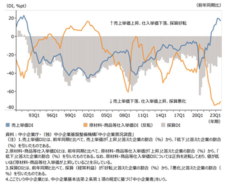 図表1-2:売上単価DI、原材料・商品等仕入単価DI、採算(経常利益)DIの推移