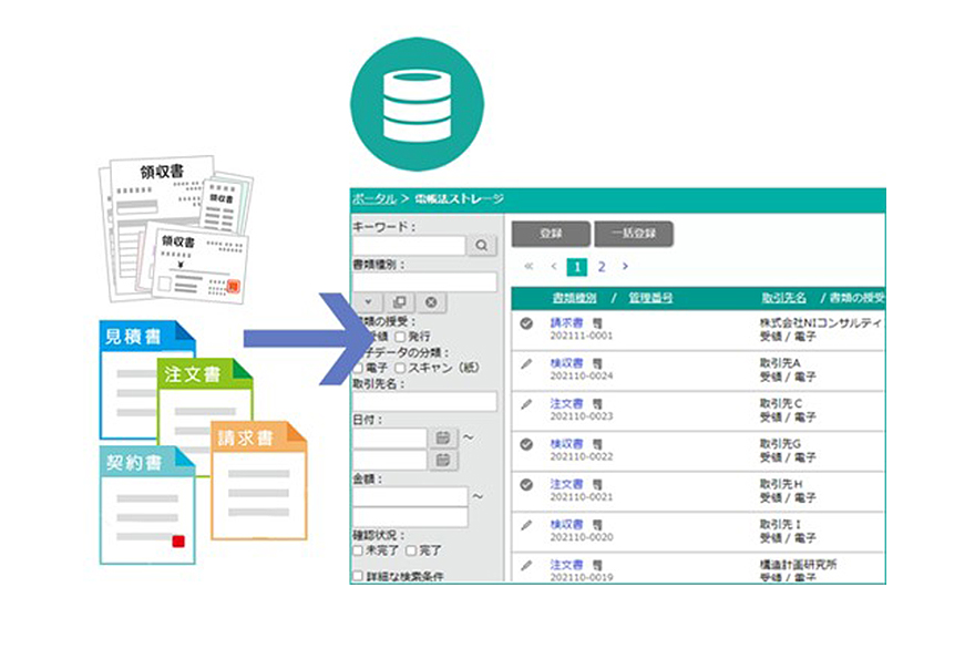 NI Collabo 360は電子帳簿保存法(電帳法)にも対応しています。保存したい書類を複合機でスキャンしアップロードすることで、電帳法に対応した専用ストレージにダイレクトに保存されます。ポータル画面での登録はもちろん、メール・ファクスからの転送登録やワークフロー経由での登録などにも対応しているため、電帳法関連書類の管理を一元化できます。