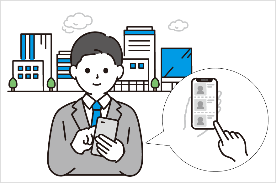 スマートフォンでSKYPCEにアクセスし、名刺情報を開くだけで、電話番号をタップしてそのまま発信できます。アドレス帳に登録していない相手でも、名刺情報からすぐに電話をかけることができるので、外出先や急な連絡が必要な場面でも非常に便利です。例えば、外出先で急にお客さまへ連絡が必要になったとき、アドレス帳に登録していなくてもSKYPCEから直接電話をかけられるため、これまでのように名刺を見ながら番号を手入力したり、アドレス帳に登録する手間がありません。