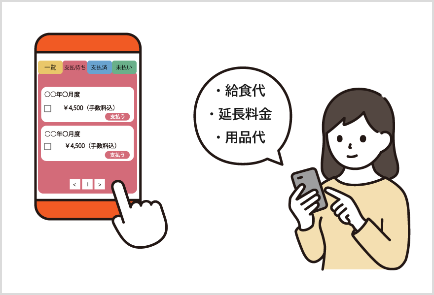 月次で計算した請求額が決済サービスと自動連携されることで、集金業務が大幅に効率化されます。先生は各家庭の口座情報の管理や毎月の金融機関とのやり取りを削減できます。保護者はスマートフォンに届く請求情報を確認し、空き時間を活用して支払処理を完了できます。人の手で行う集金のヒューマンエラーを防ぎ、先生も保護者もお金が絡むストレスから解消されます。