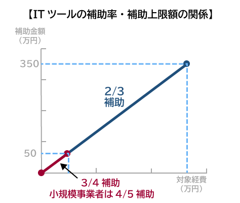 補助金額50万円までは、補助率は3/4(※小規模事業者は4/5)。50万円超から350万円までは2/3となりました。ITツールの費用がどれくらいになるかに応じて、3/4を掛け合わせるところと、2/3を掛け合わせるところで分かれることになります。