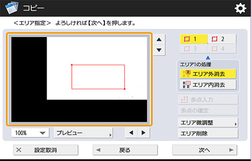 原稿が読み込まれ、プレビュー画面が表示されるので、プレビュー画面上で範囲を指定し、「エリア外消去」・「エリア内消去」のいずれかを選択します。