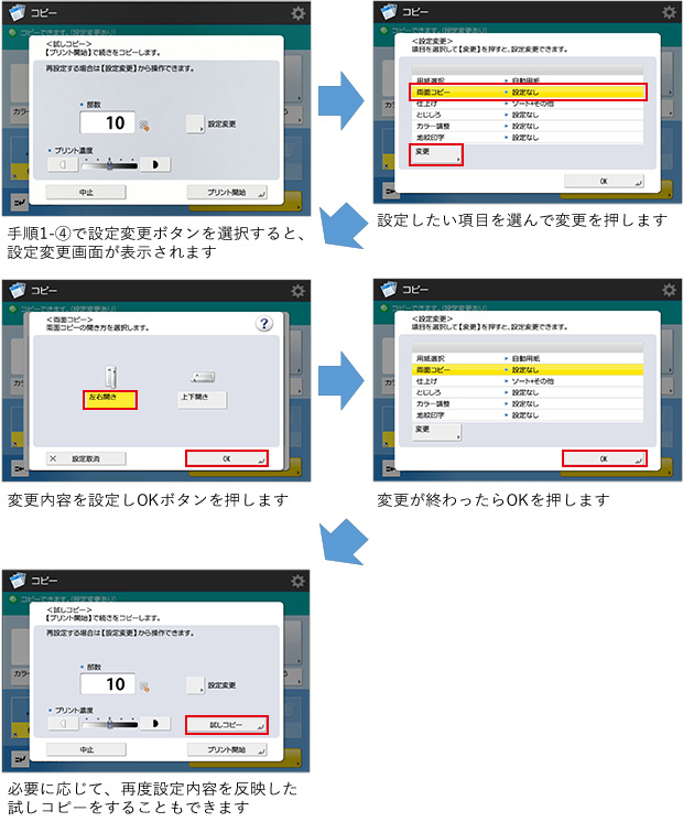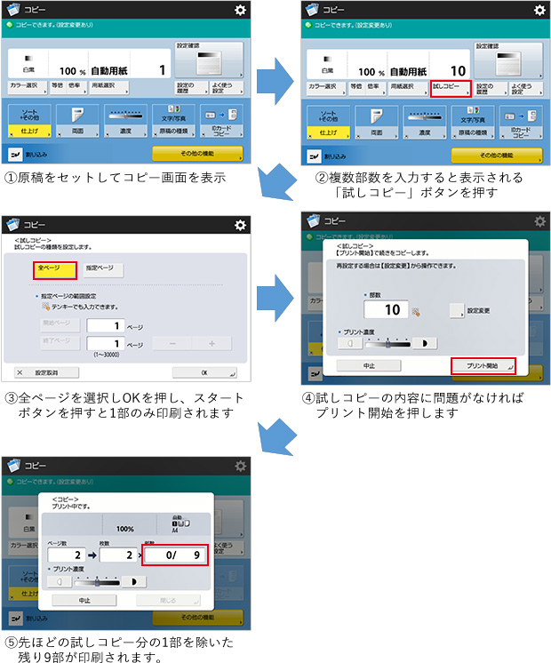 「試しコピー」機能は、複数部のコピーをとる前に、試しに1部だけコピーをとって仕上がりを確認できる機能です。全てのページだけでなく、指定したページのみの仕上がりを確認することもでき、確認後に指定した部数をコピーできます。