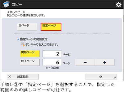 仕上がりのページ数を基準にして、試しコピーしたいページの範囲を指定します。