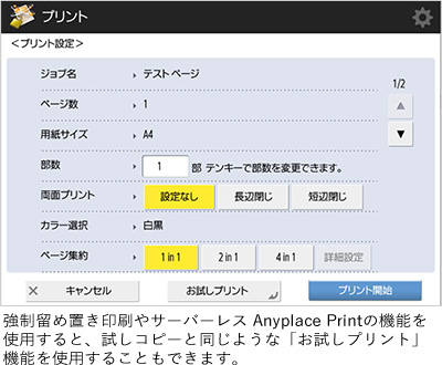 ページ数や部数が多いコピーをとった後にミスを発見すると、時間や用紙等を大きくロスしてしまいますが、この試しコピーを利用することで、ロスを防ぐことができます。
