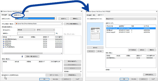 プリントアウトが不要で用紙コストを削減できるとともに、汚れやかすれのない鮮明な送信が行なえるPC-FAX。FAXドライバーの設定画面上にある「送信イメージを保存する」にチェックを入れるだけで、送信した文書名や送信時刻などを送信イメージとして保存できます。履歴は、[送信イメージ]シートで確認できます。