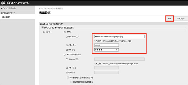 保存したファイルサーバーへのパスと、アクセスに必要なユーザー名とパスワードを指定し「OK」ボタンで閉じます。