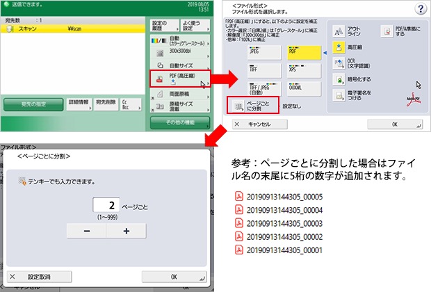 複合機の「スキャンして送信」のファイル形式の設定ボタン(注 下の画像の場合は赤枠の「PDF(高圧縮)」ボタン)を押し、<ファイル形式>画面で「ページごとに分割」ボタンを押します。
