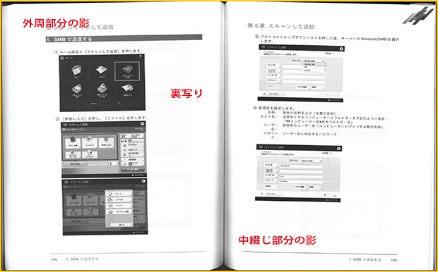 本や冊子を原稿台に置いてスキャンすると、中綴じ部分や外周部分が影として黒く写ってしまいます。