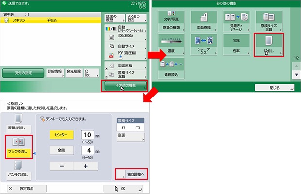 <スキャンして送信>画面の「その他の機能」「枠消し」「ブック枠消し」の順に押し、影を消す部分の範囲をmmで指定したあと、スキャンを実行します。ここで指定したエリアの画像は読み込まれません。