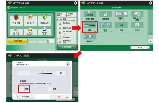 「スキャンして送信」の「その他の機能」より「濃度」を調整します。