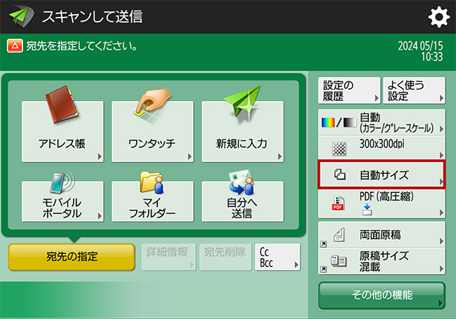 原稿をセットして宛先を指定したあと、読取サイズボタン(画像では自動サイズと表記されている箇所)を押します。