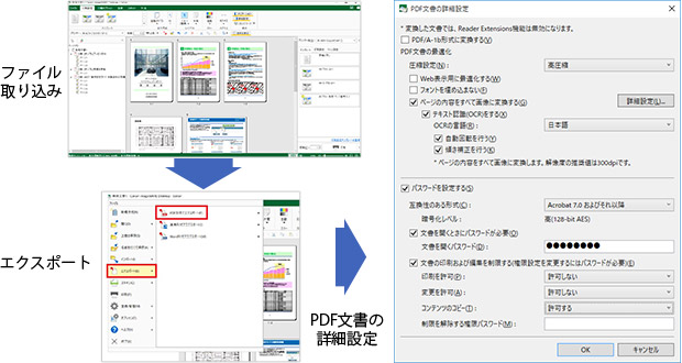 PDFでエクスポートする際には、OCR処理によってPDF内の文字を検索できるようにしたり、閲覧や印刷といった機能にパスワード制限をかけたりすることが出来ます。Word形式の場合は文字がテキストボックス形式でエクスポートされますので、記載されている文言の修正や再利用がしやすくなりますよ。