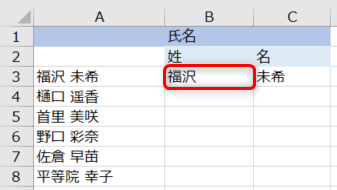 一番初めの行の姓名を、それぞれ該当のセルに手入力もしくはコピーして入力します。