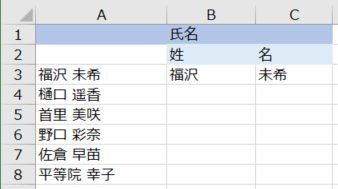 リストを管理する上で、姓と名を別々のセルに分けたいと思います。