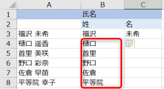 氏名が入力されている行の全てのセルに、姓が入力されました。