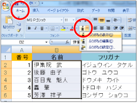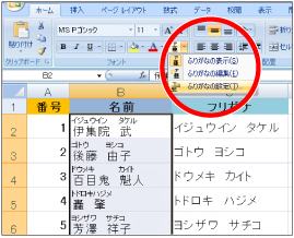 対象となるセルを選択し、「ふりがなの表示/非表示」ボタン横の「▼」を押して、展開したメニューから「ふりがなの設定」を選択します。
