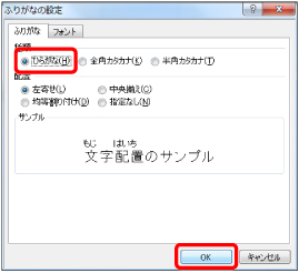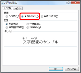「ふりがなの設定」メニューが開きます。ふりがなの種類は「全角カタカナ」になっています。