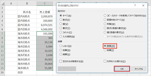 「演算」の「乗算」を選択し、「OK」ボタンをクリックします。