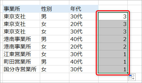 検索範囲と検索条件を変えることで、性別や年代の項目もカテゴリごとに何人の人がいるのかを数えることが可能です。
