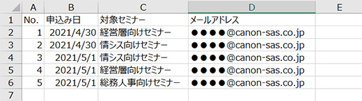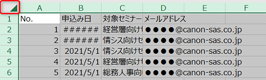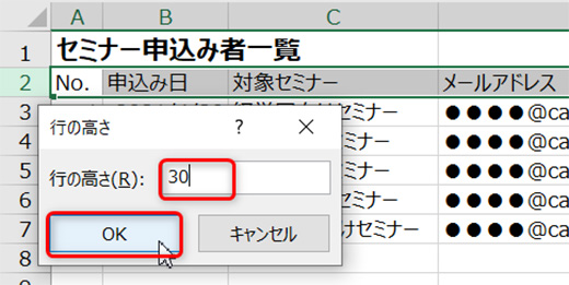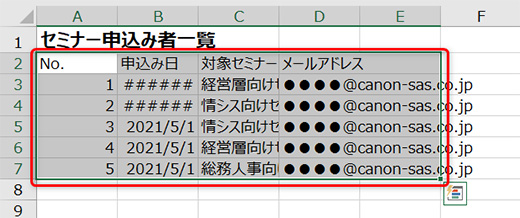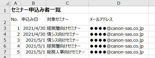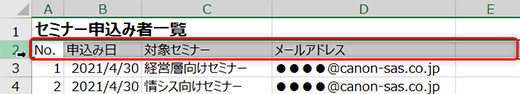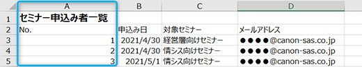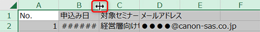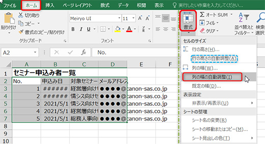あなたはExcelでセミナーの申込者情報をまとめています。元々の行・列の幅だと文字が表示しきれないため、セルごとに幅を調整する必要があります。