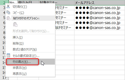 右クリックし「行の高さ」(列の場合は「列の幅」)を選択します。